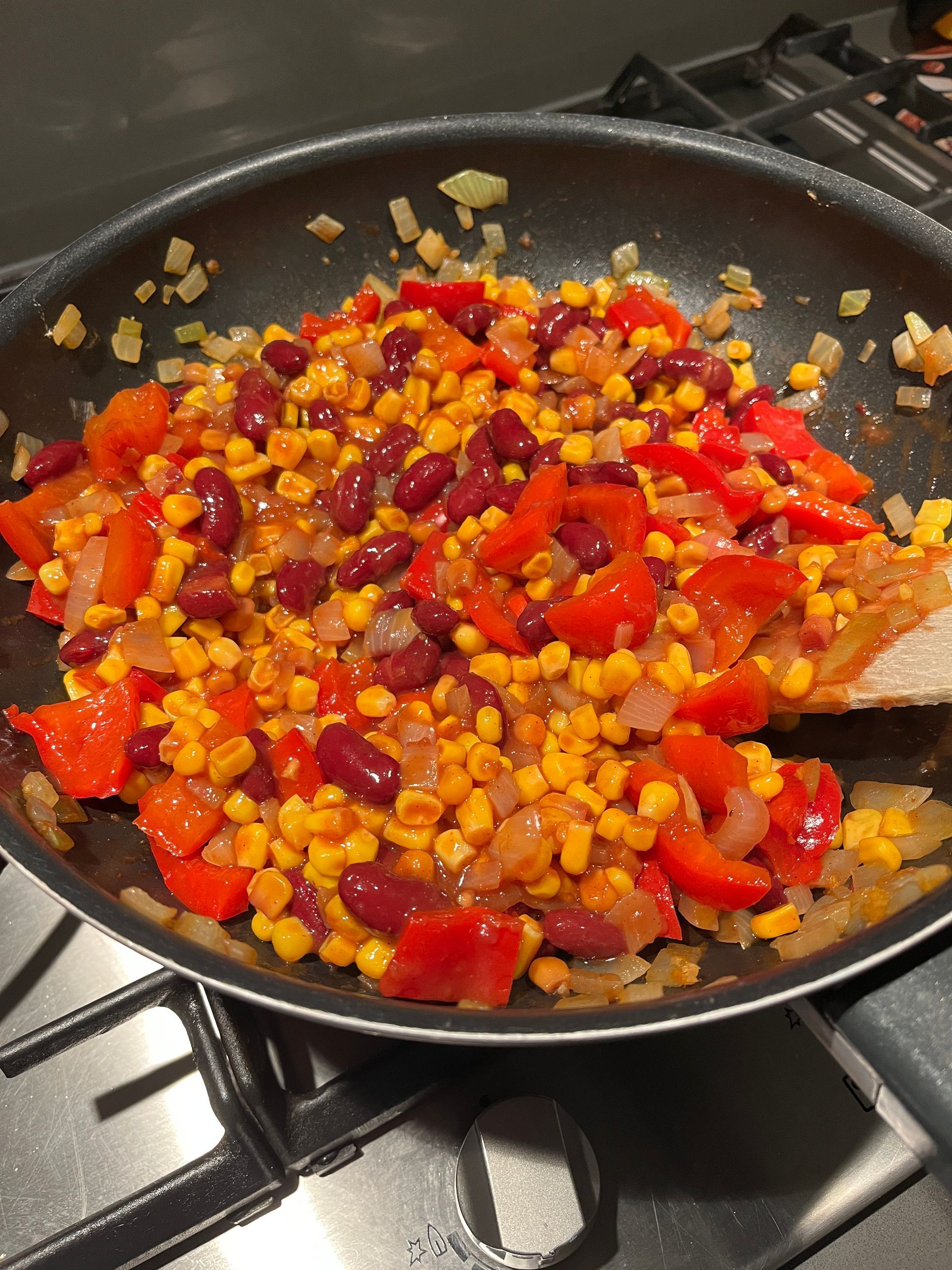 Ik ging koken en Sara kwam mij helpen. We sneden groenten en maakten een pan vol. Dat ging in een ovenschaal met tortilla chips en kaas eroverheen, een lekkere tortilla schotel. Snel gemaakt met de hulp en erg lekker.