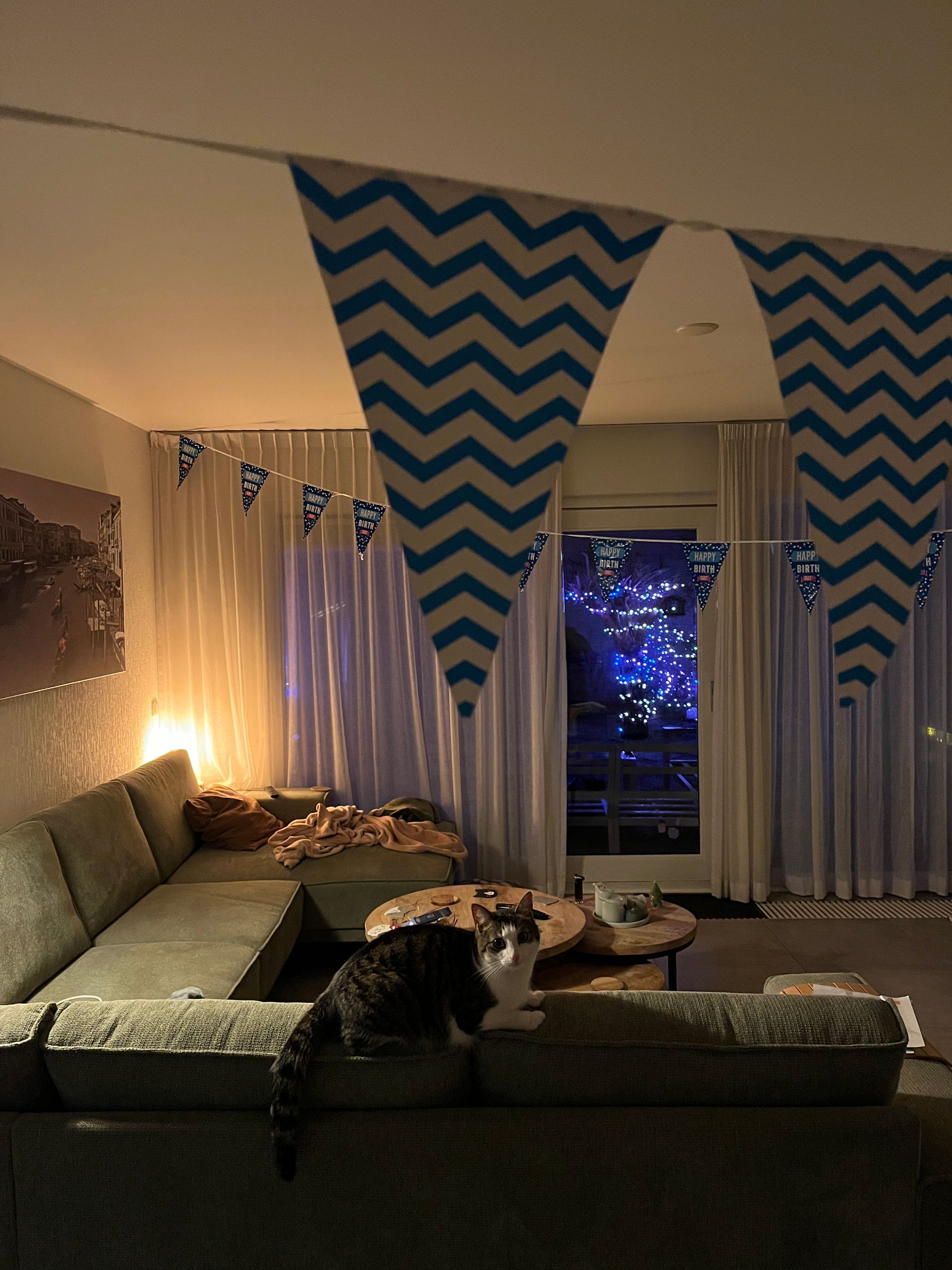 Toen alle visite weer weg was en de kinderen in bed lagen, ben ik de woonkamer gaan versieren met slingers, altijd leuk om te doen! Bobby hielp vooral mee door achter de slingers aan te rennen en erop te gaan liggen als ik ze wilde ophangen.. ;)
