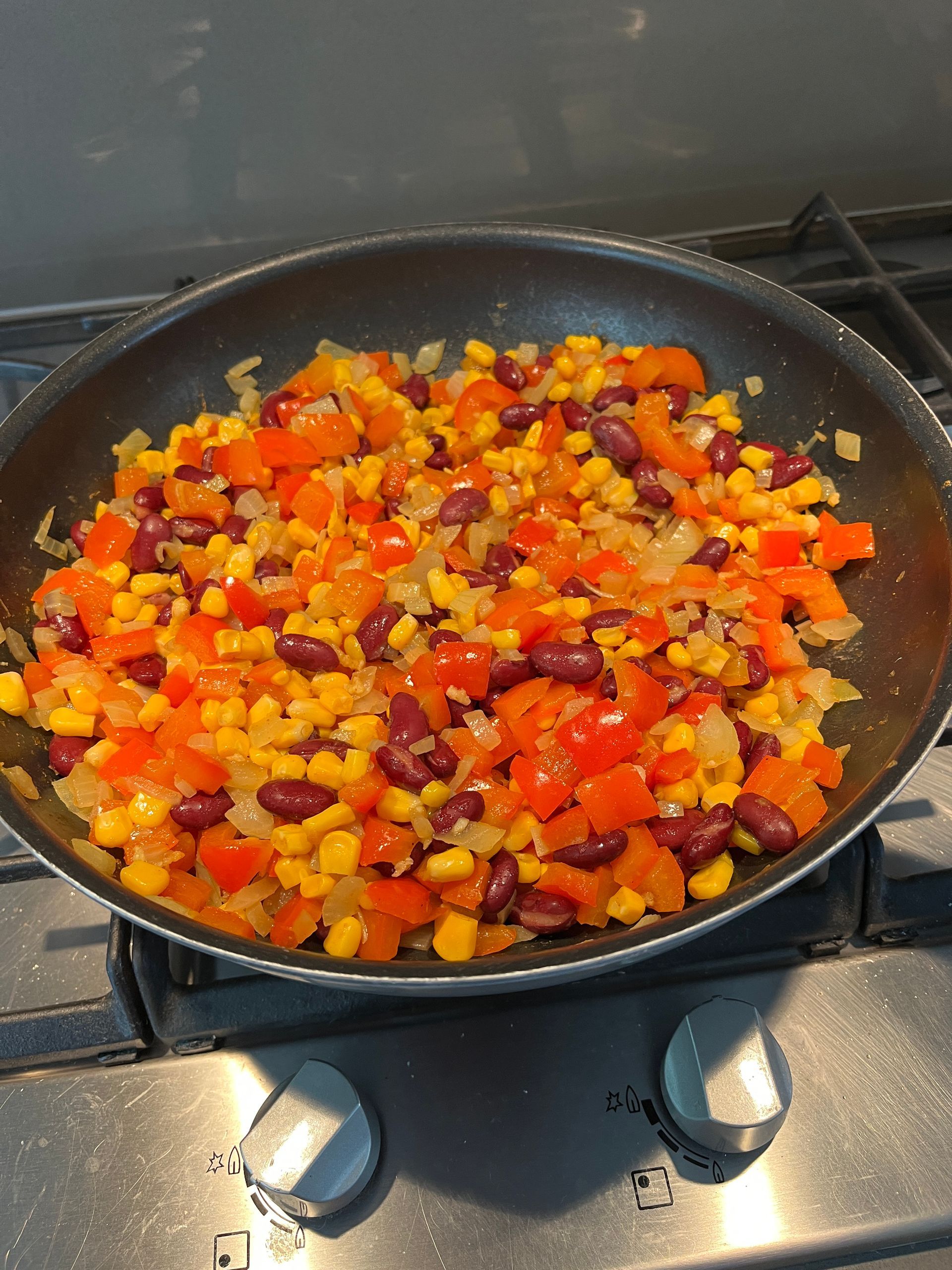 Dinsdagmiddag begin ik alvast met koken. We eten wraps en ik maak alvast de vulling, omdat er getraind moet worden. We eten deze keer een vega vulling met ui, knoflook, paprika, kidneybonen en mais... altijd lekker.