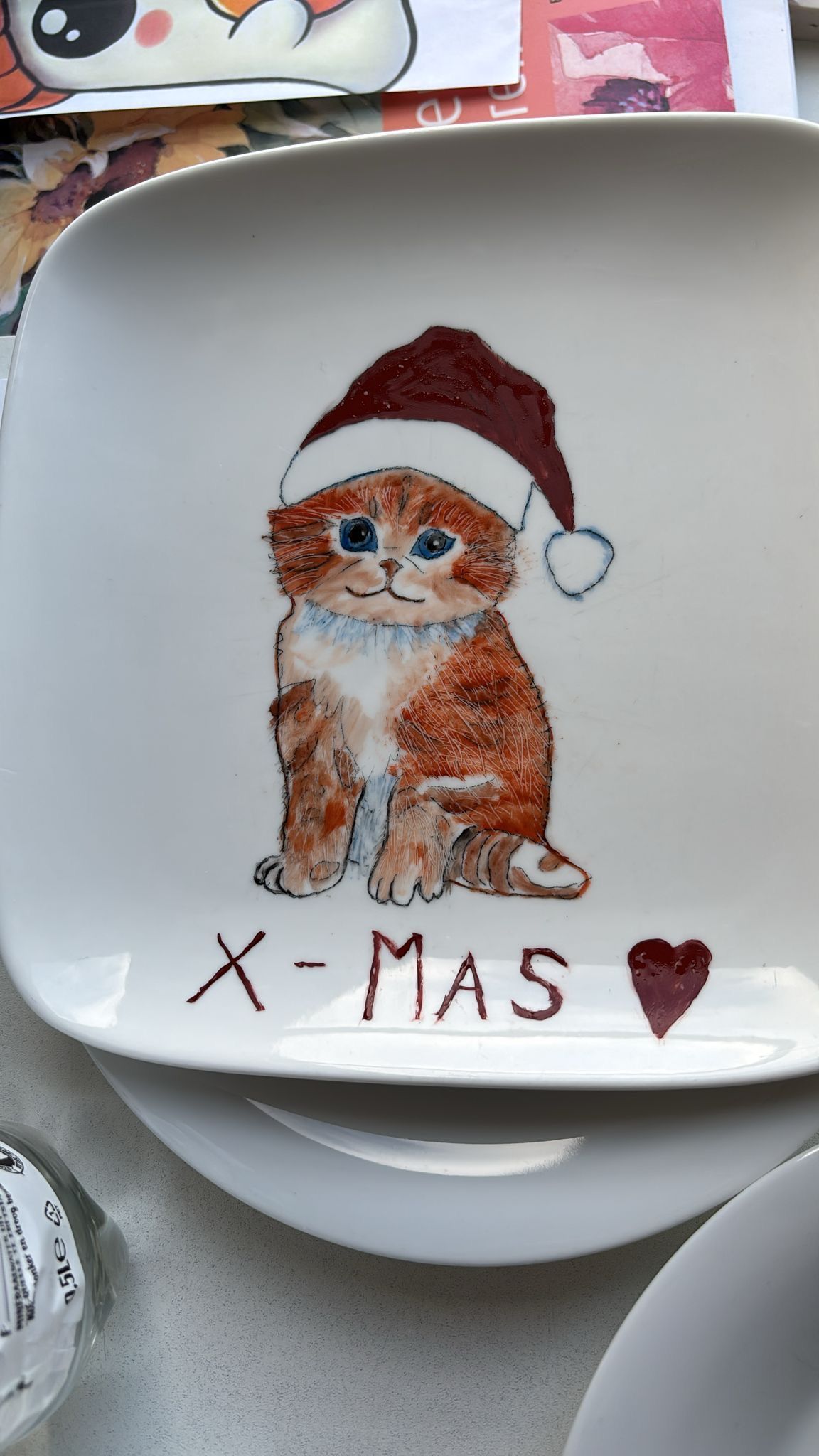 Een leuk bord in kerstsfeer! Het duurt nog even voordat ze de borden hebben, want die moeten eerst in de oven om te branden. Maar daarna kunnen ze de borden gebruiken, super leuk!