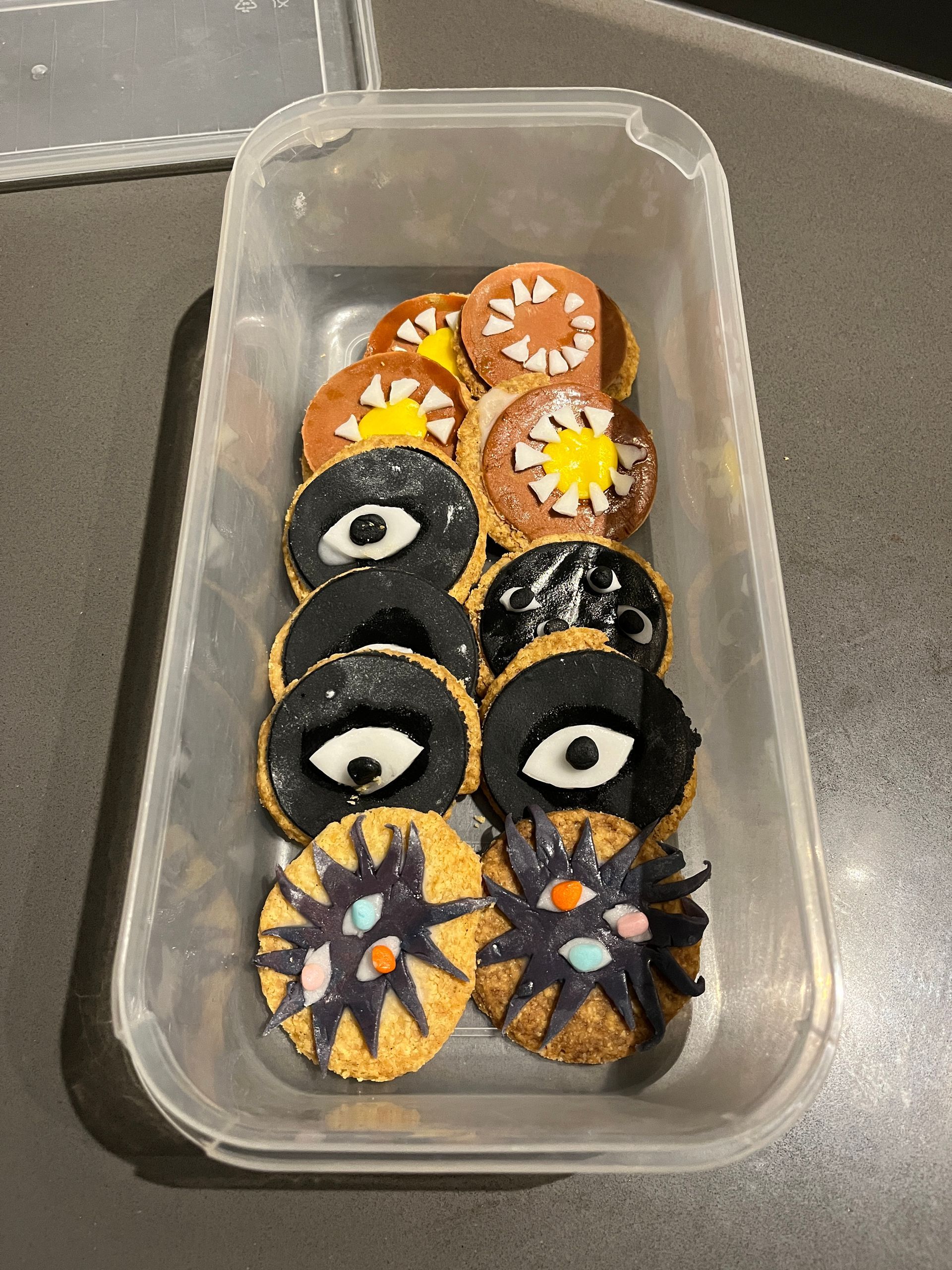 Thijs kwam ook weer thuis. Hij had zich prima vermaakt met onder andere bakken. Hij maakte koeken van het spel Doors en ze waren erg leuk geworden. Hij had ook een hele leuke dag gehad bij opa en oma.