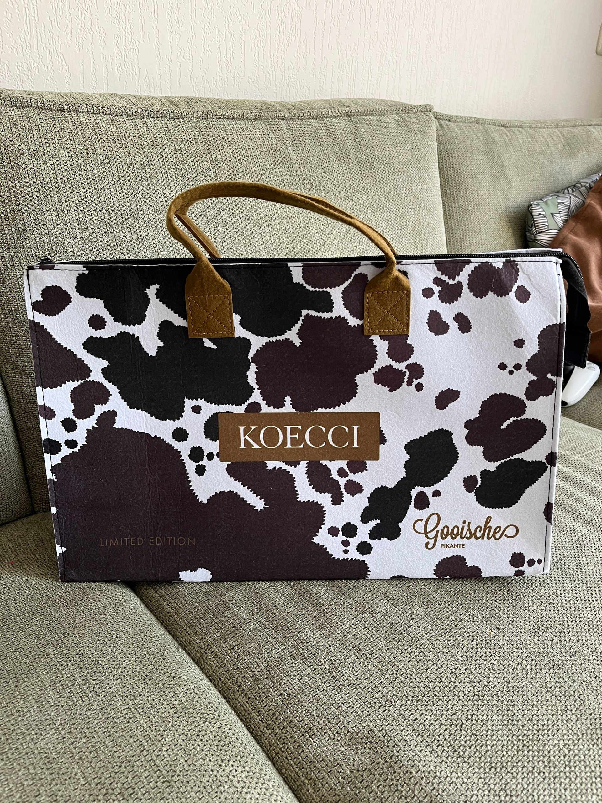 Sofie en ik konden uitchecken en gingen op de terugweg nog langs een andere kringloopwinkel en even langs een kaaswinkel. Ik heb daar vroeger in de buurt gewerkt, dus ik ken het kleine winkeltje nog van die tijd... zo'n leuk winkeltje met kaas, nootjes, chocolade etc. We namen een stuk boerenkaas mee en kregen deze geweldige "Koecci" tas mee, haha! Daarna reden we weer naar huis, we hebben het samen heel gezellig gehad!