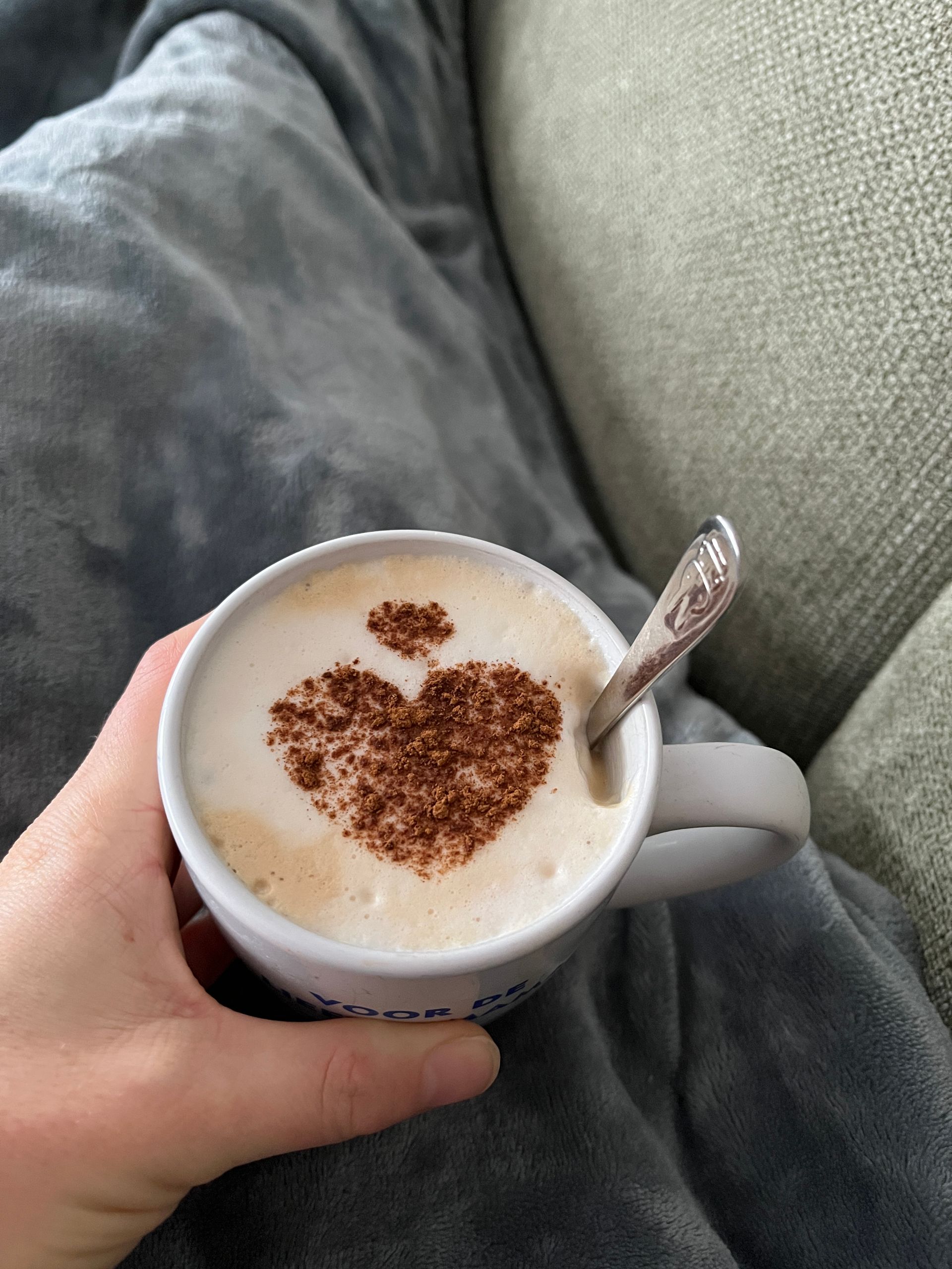 Zaterdagochtend kreeg ik weer een heerlijke kop koffie. Sofie had met het winkelen van die sjablonen gekocht voor de koffie, dus ik kreeg een hartje van kaneel <3
