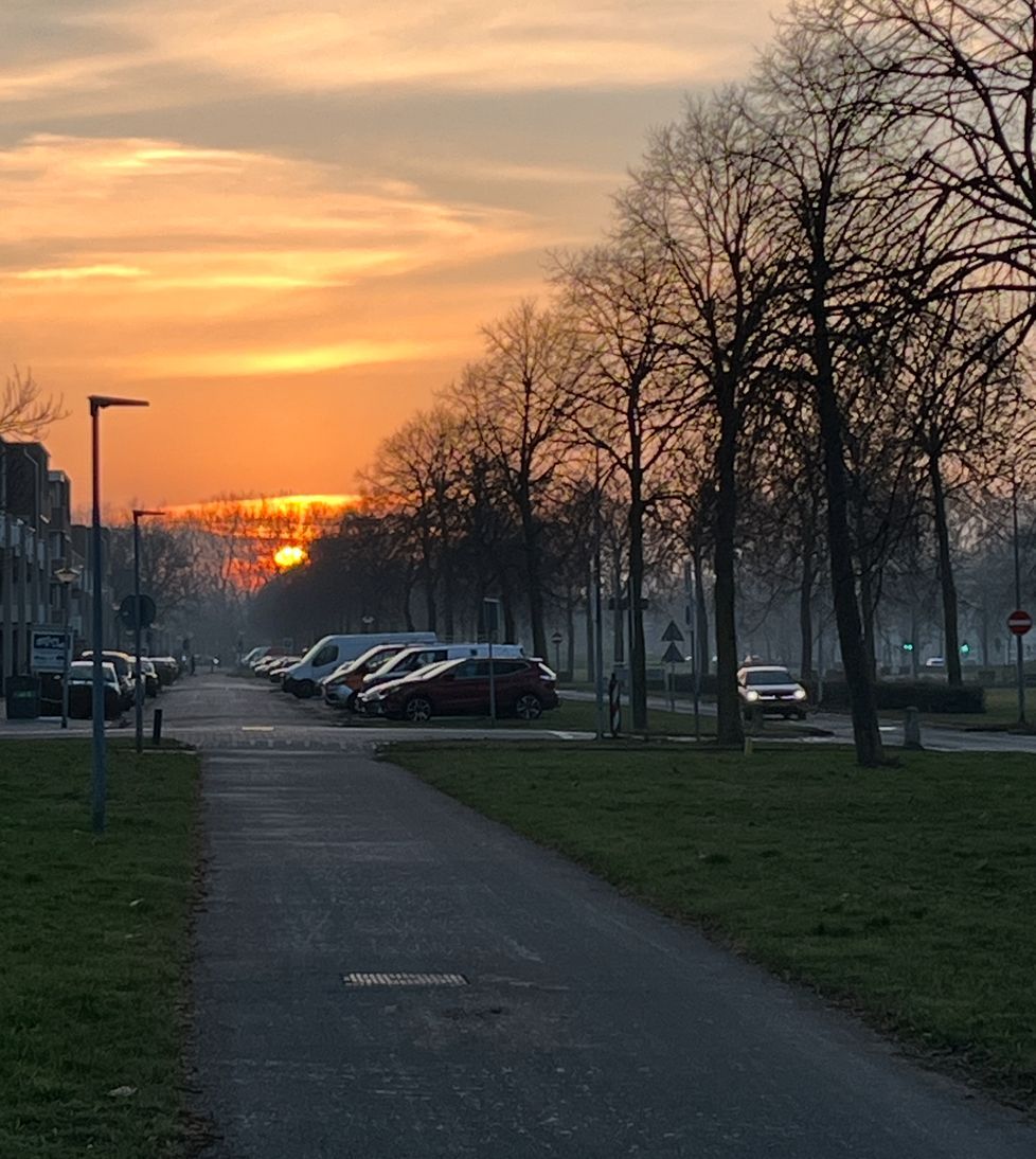 's middags gaan we nog even naar de bieb (een gereserveerd boek ophalen) en als we bijna gaan koken bedenkt Sara dat ze wel guacamole bij de tortilla's wilt maken! Dustin gaat alvast aan de slag en ik wandel met haar nog even naar de supermarkt voor avocado's... met een mooie zonsondergang onderweg.