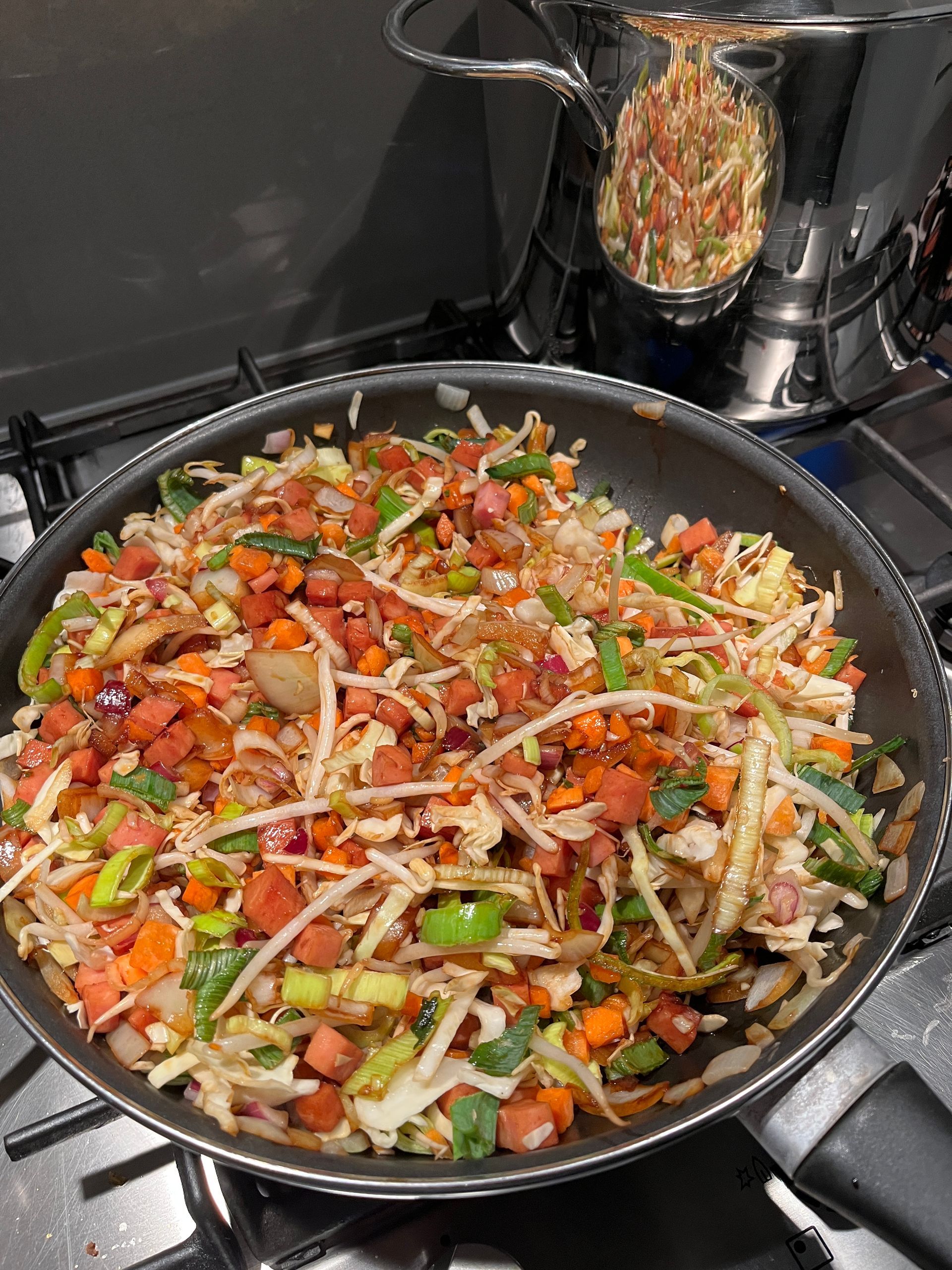 We beginnen de week natuurlijk op maandag. We hadden een gewone werk en schooldag. Ik maakte een grote pan vol bami, zodat wij er dinsdag ook nog van konden eten. Ideaal met alle trainingen om meteen voor 2 dagen te koken. Sara kwam gezellig helpen met koken en we begonnen natuurlijk met een pan vol groenten.