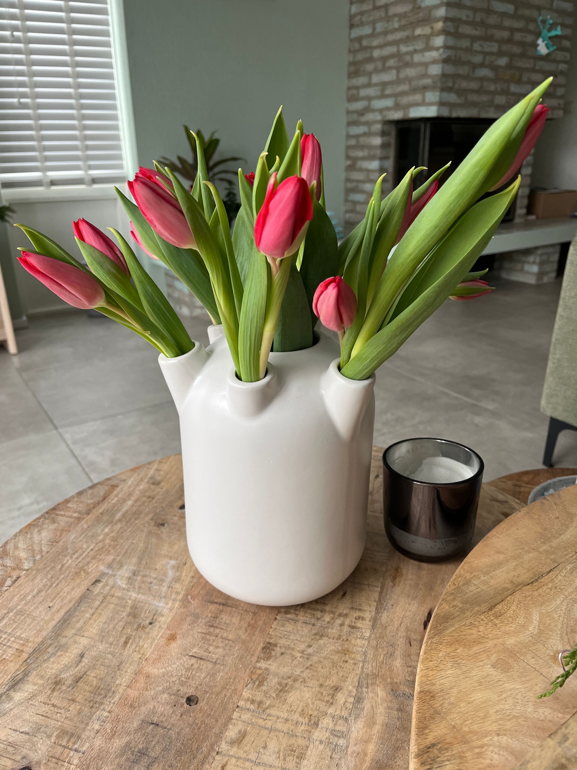 Woensdagochtend doet Dustin boodschappen en komt hij ook thuis met een paar bosjes tulpen. Ik ben echt gek op tulpen, dus dat is een leuke verrassing. Twee jaar terug kocht ik deze tulpenvaas en als die weer uit de kast kan, dan ben ik altijd weer blij, haha!