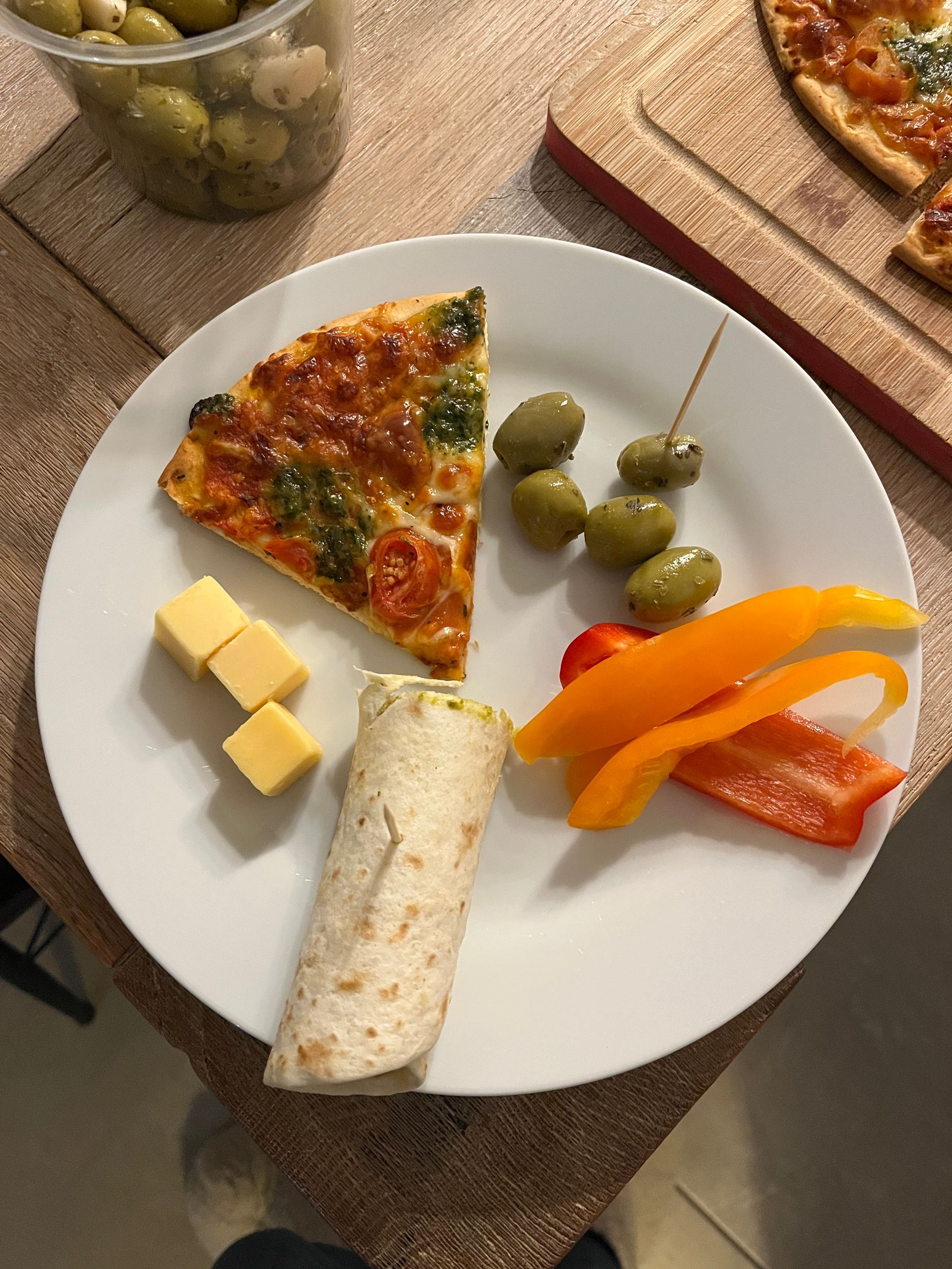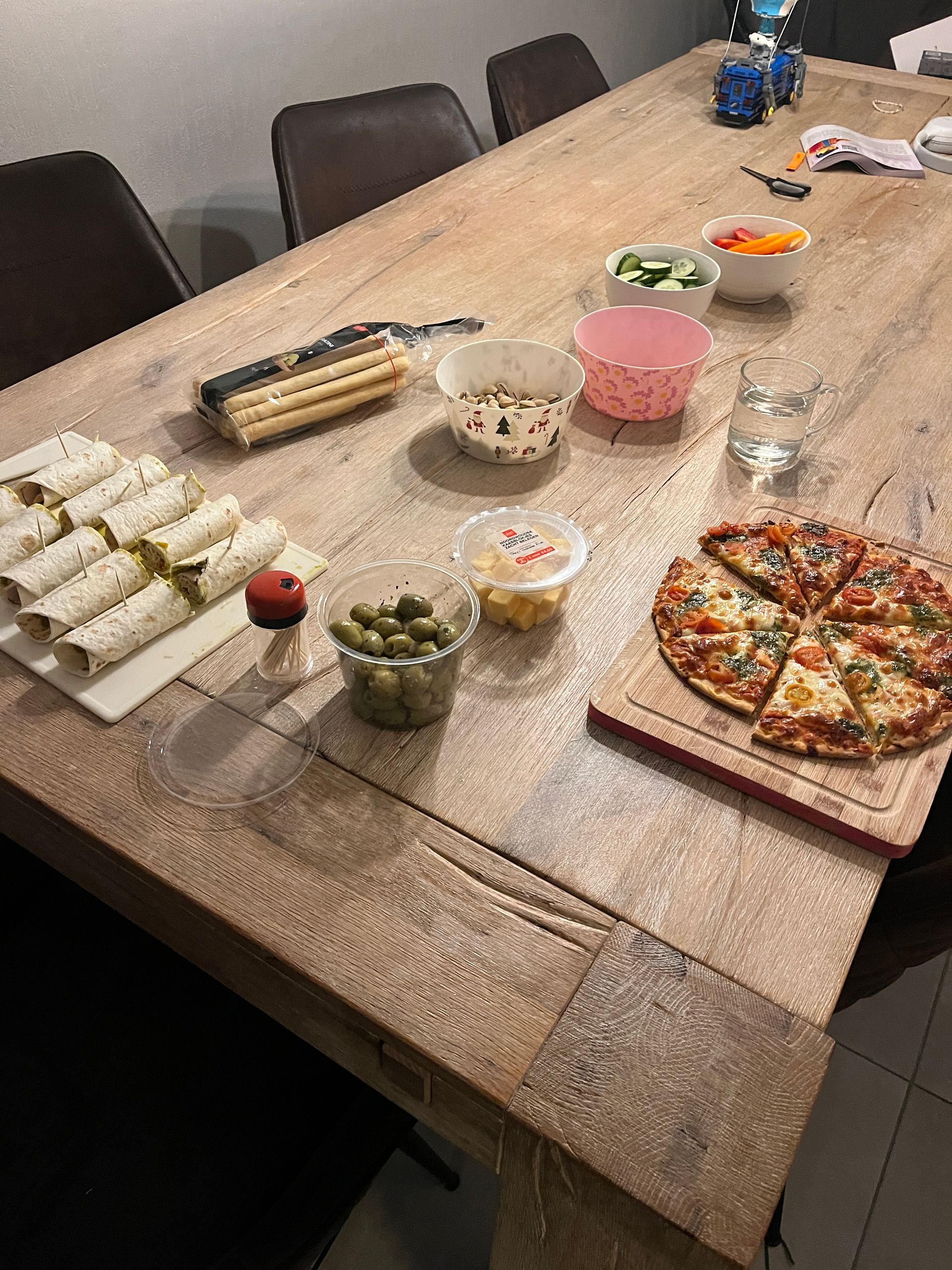 Daarna sluiten wij de week af met wat hapjes op tafel, dat is weer lang geleden! We hebben lekker wraps met kipfilet, pesto en paprika, nootjes, snoepgroenten, pizza, frikandelbroodjes en meer.. lekker hoor. We zetten een film op en eten lekker op de bank.