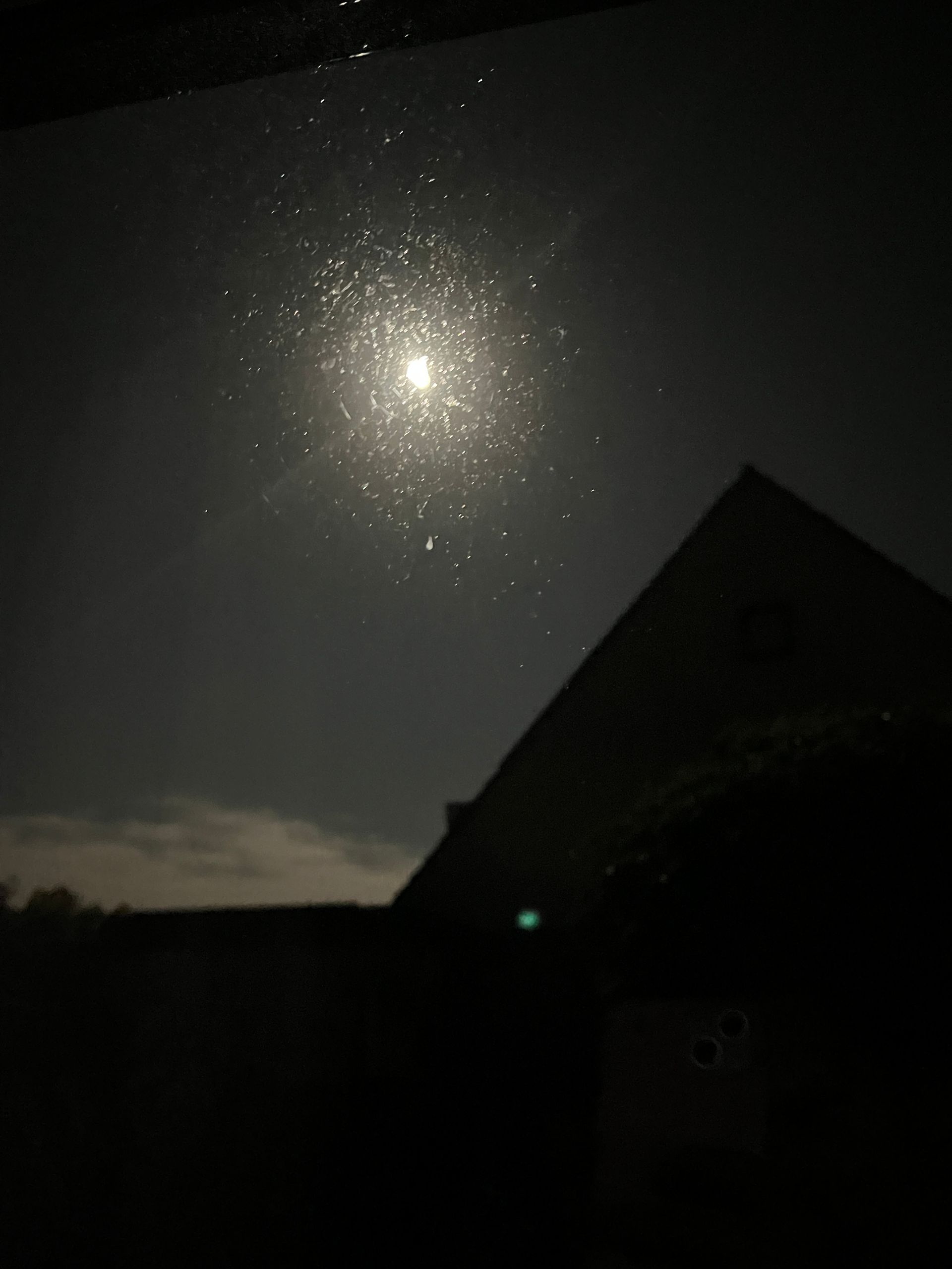 In de nacht van maandag op dinsdag was ik nog even wakker... Bobby ligt soms boven te slapen en is dan vrij vroeg alweer "up and running".... als dat gebeurt dan brengen we hem even naar beneden en dan kan iedereen rustig verder slapen. ;) Toen ik beneden kwam zag ik een hele felle maan, de hele kamer was verlicht, prachtig! Je kunt het niet heel goed zien, maar toch een mooie foto van 03.15u 's nachts.