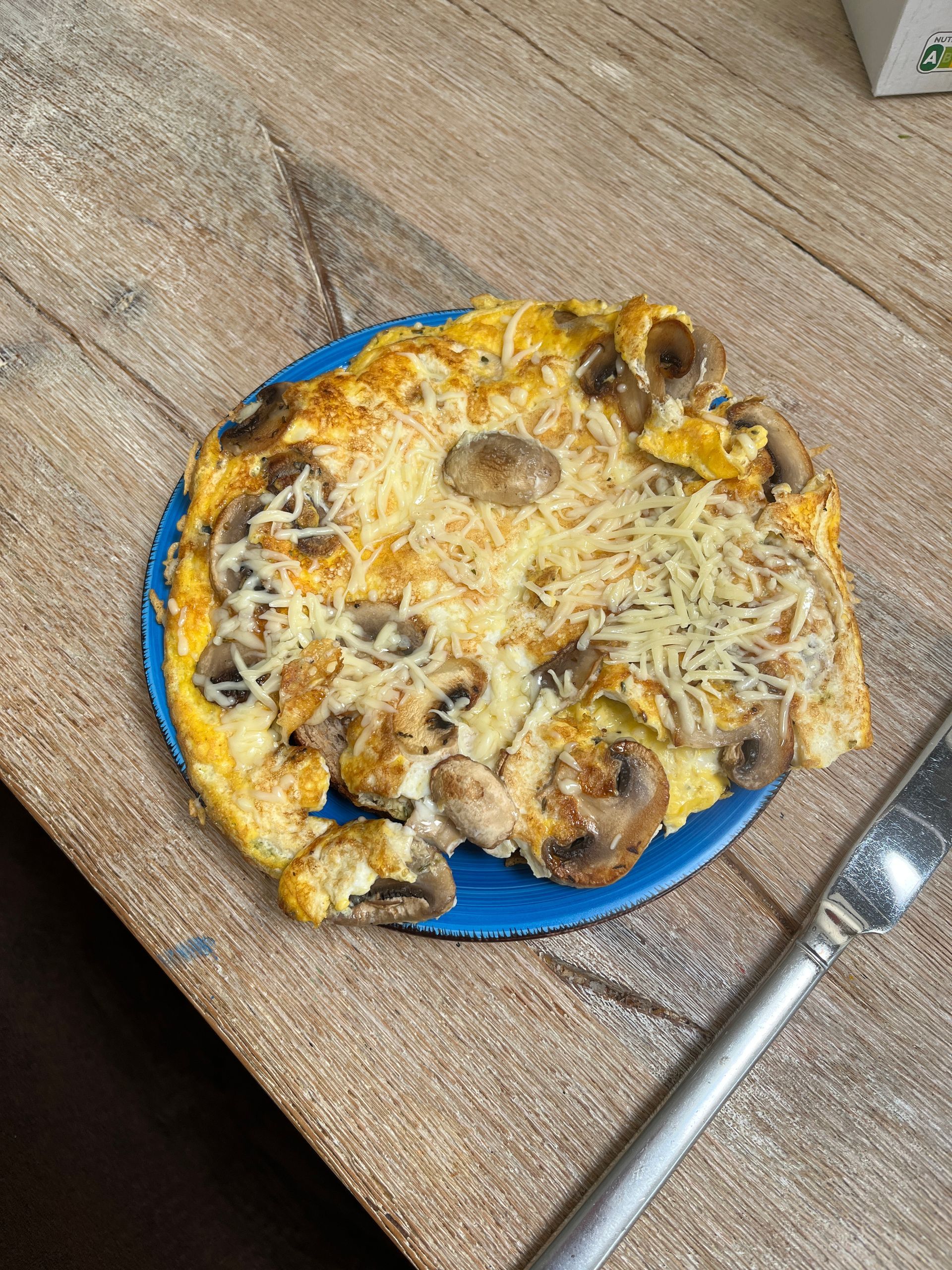 We hadden van de pizza nog wat champignons over... en de meiden gingen bij een vriendinnetje eten, dus ik maakte voor de lunch een lekker eitje met champignons en kaas.