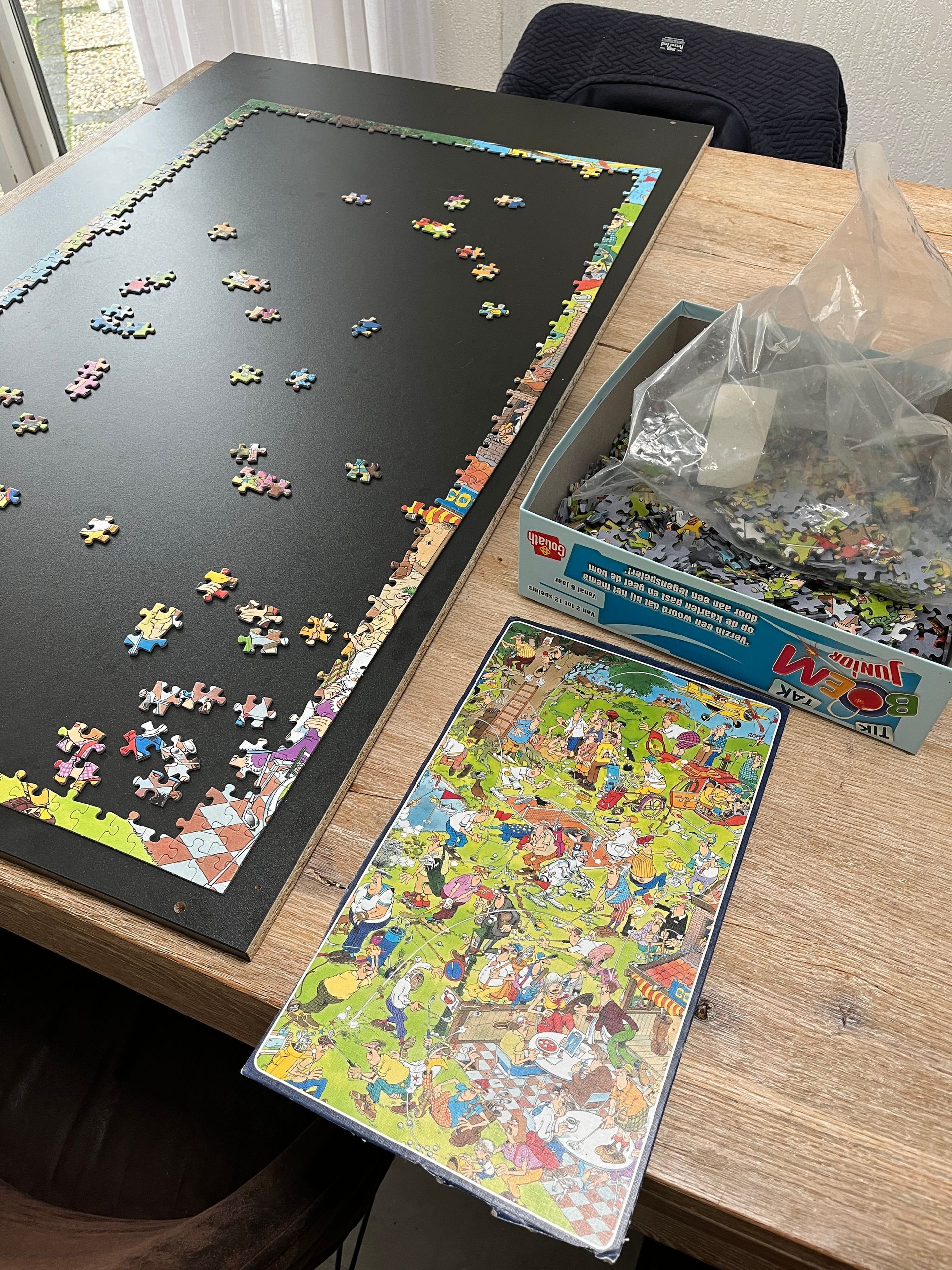 Daarna begonnen we hier weer aan een nieuw puzzel.. Nu hebben we er een plank onder liggen, dat is wel handig, want er eet hier regelmatig iemand mee en dan kunnen we de puzzel gewoon even wegleggen als we de tafel "nodig" hebben. Eens kijken wanneer we deze weer afmaken!