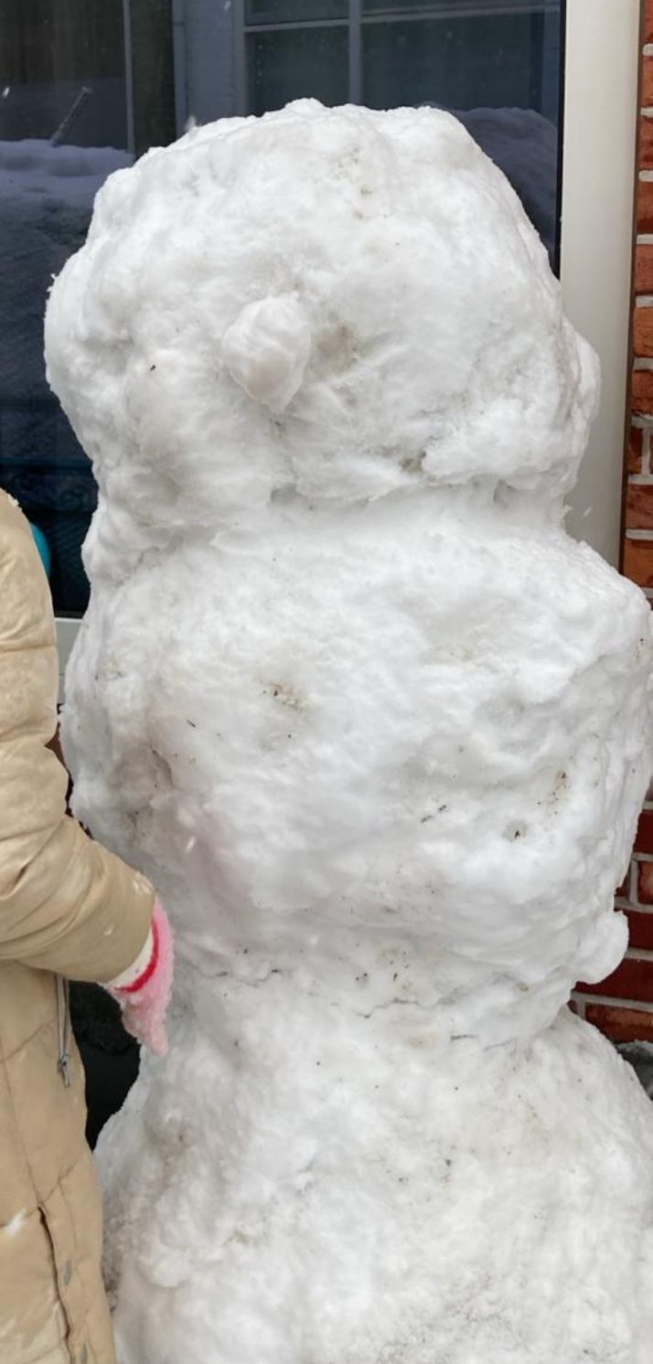 Het weer was vrijdag op zaterdag een beetje vreemd. Wij hadden in Almere onweer met ook een keer een mega knal, bizar hard! En de rest van de nacht ook nog wat onweer. We werden wakker met een klein laagje sneeuw. Onze meiden logeerden in Utrecht en zij werden wakker met een enorm pak sneeuw! Deze sneeuwpop werd nog hoger en hoger, zoals je ziet nog langer dan onze meiden, wat een sneeuw!
