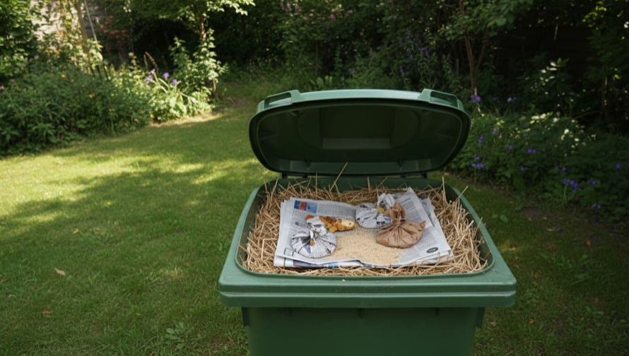 Wikkel etensresten in krantenpapier. Vooral vleesresten en nat keukenafval wil je verstoppen. Zo ruikt het minder sterk en kunnen vliegen er minder goed bij. Een anti stank deksel of anti stank deksel gft kan geur afremmen. Zie dat als extra hulp, niet als hoofdoplossing.